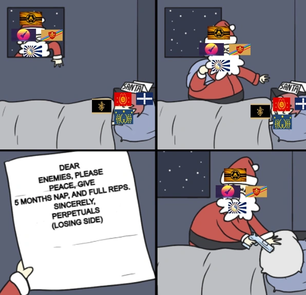 Homicide for the Holidays is a war that started when The Hive alongside Aurora, The Wei, and Serene Repubblica Fiorentina begun to mass raid The Perpetuals and The Grand Federation