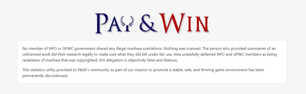 NPO announcing the closure of the stat page for the P&W community coupled with a message denying all allegations of cheating.